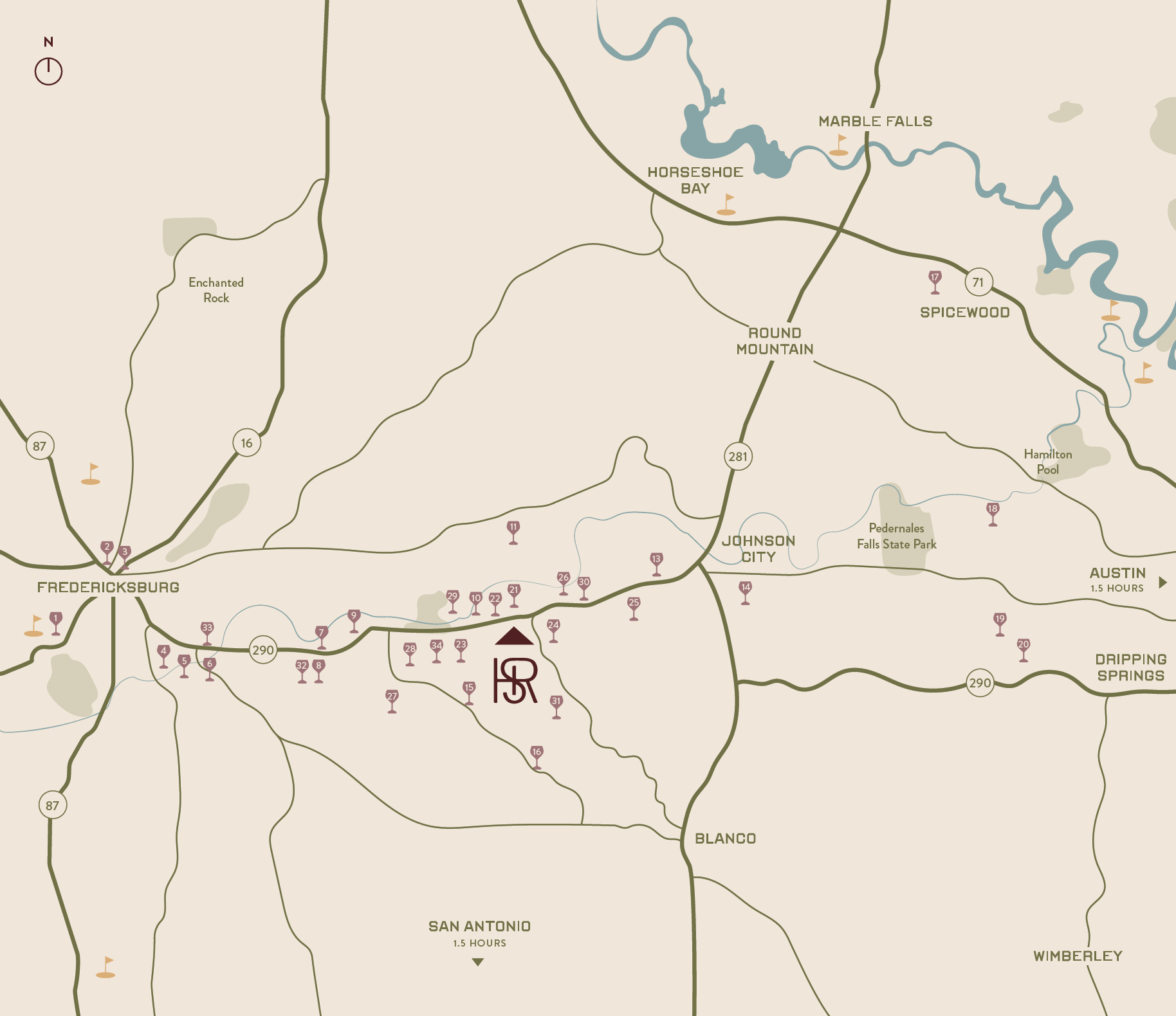 Hye Springs Ranch is surrounded by the scenic beauty of the Texas Hill Country, one of the most celebrated wine regions in the nation. More than one hundred wineries and vineyards stretch across the rolling landscape, creating a true haven for wine enthusiasts and travelers seeking an authentic Hill Country experience. The community offers peaceful views and quiet acreage within minutes of Fredericksburg, pairing natural beauty with access to tasting rooms, dining, and boutique shopping.